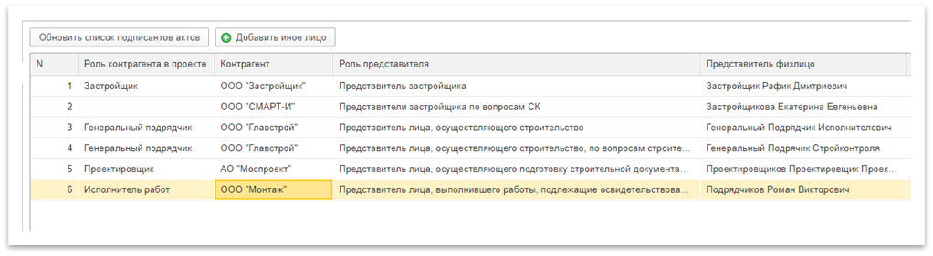 Если в качестве исполнителя указан контрагент с ролью Генеральный подрядчик, то на страницу подписанты выводятся строки без указания подрядчика.