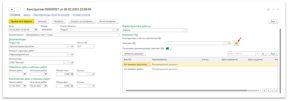 Создание комплекта исполнительной документации. Откройте Конструктив, для которого требуется подготовить исполнительную документацию. В правой части формы Конструктива, в подразделе «Комплект ИД», нажмите кнопку «
