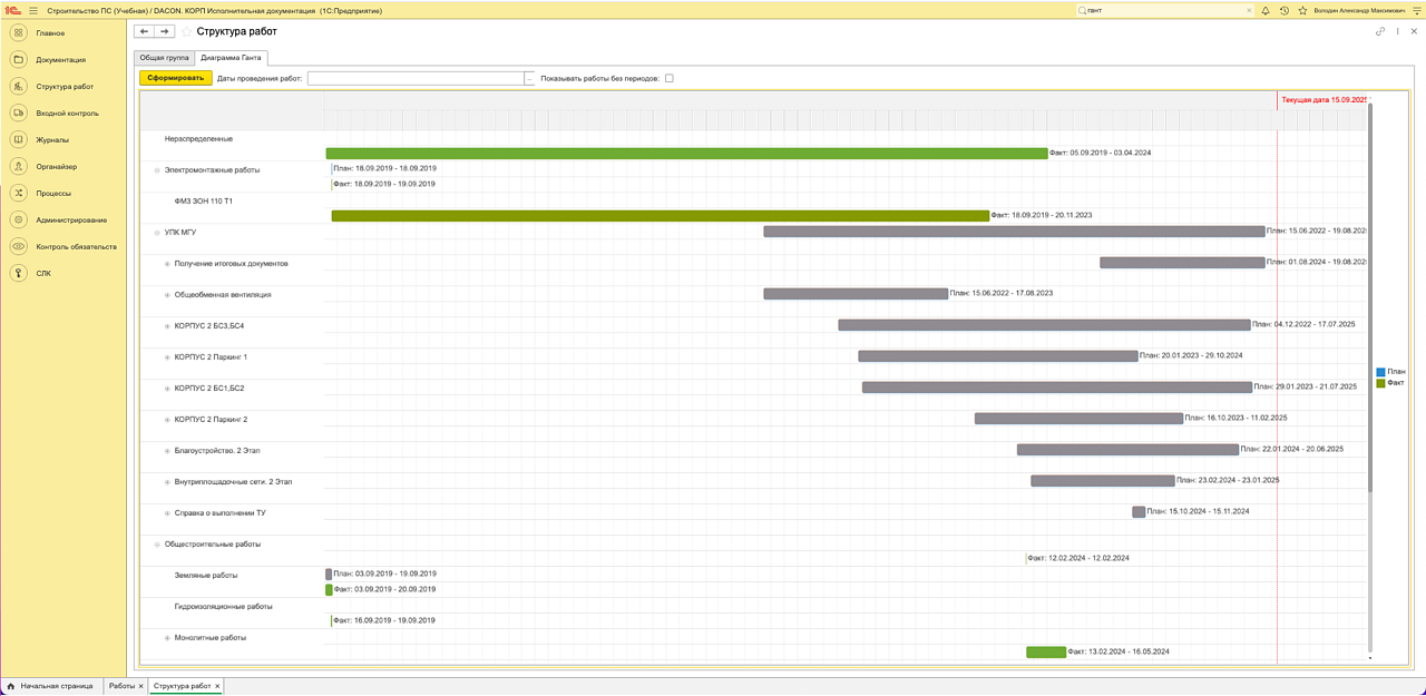 Построение диаграммы Ганта. В разделе «Структура работ» можно построить диаграмму Ганта на основании плановых и фактических дат выполнения работ, указанных в элементах структуры.