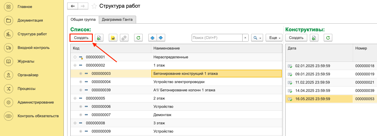 Создание структуры работ. В меню «Структура работ» необходимо открыть раздел «Структура работ» и нажать кнопку «Создать» над левой табличной частью (Рисунок 71).