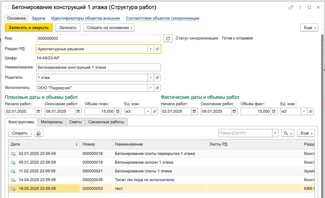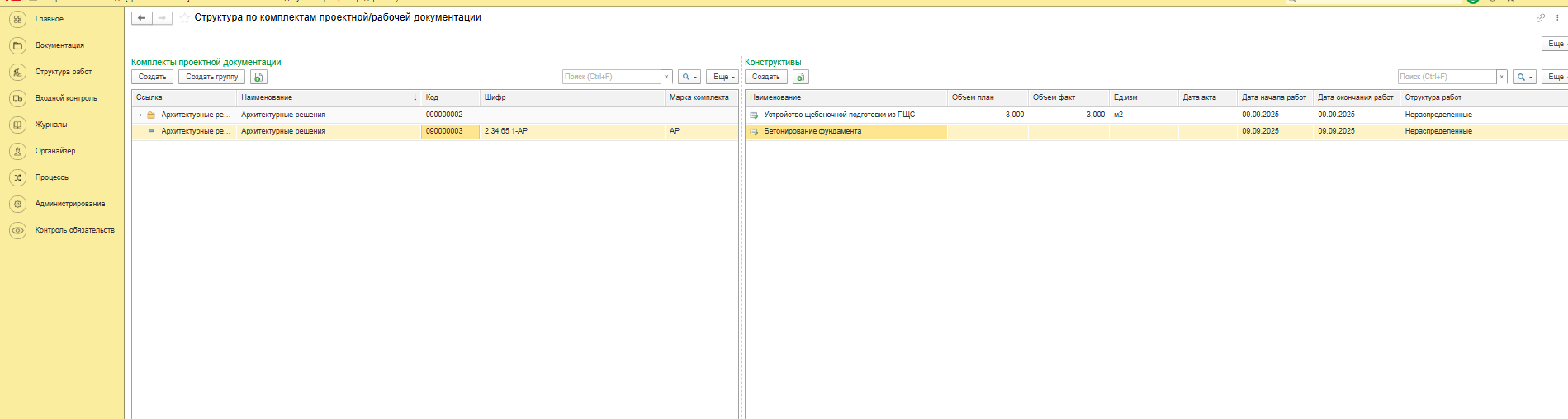 Планирование работ происходит с помощью раздела «Структура работ» (Рисунок 70), пользователь может создавать структуру и привязывать новые и уже имеющиеся конструктивы к элементам структуры работ. В левой табличной части отображается структура работ, а в правой конструктивы, входящие в выбранную структуру, с объемом плановых и фактических показателей.