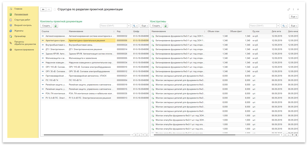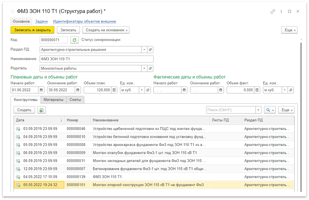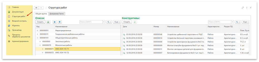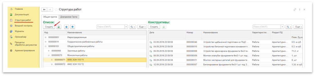 Планирование работ происходит с помощью раздела «Структура работ» (Рисунок 1)70), пользователь может создавать структуру и привязывать новые и уже имеющиеся конструктивы к элементам структуры работ. В левой табличной части отображается структура работ, а в правой конструктивы, входящие в выбранную структуру, с объемом плановых и фактических показателей.
