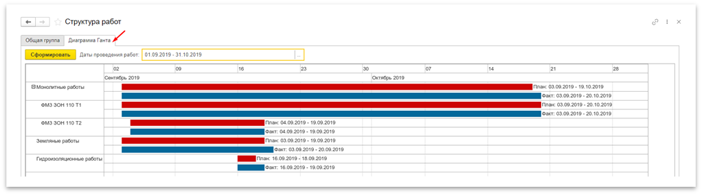 Построение диаграммы Ганта. В разделе «Структура работ» можно построить диаграмму Ганта на основании плановых и фактических дат выполнения работ, указанных в элементах структуры.