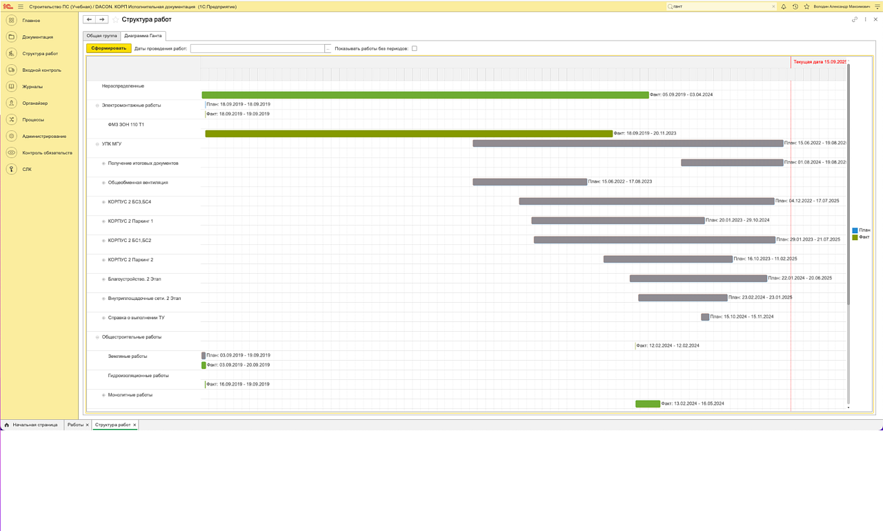 Построение диаграммы Ганта. В разделе «Структура работ» можно построить диаграмму Ганта на основании плановых и фактических дат выполнения работ, указанных в элементах структуры.
