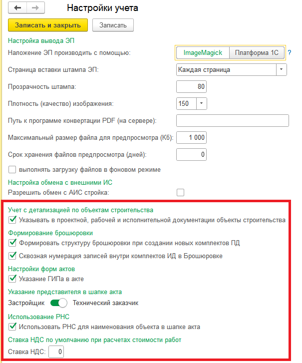 · Учет с детализацией по объектам строительства — настройка предназначена на случай, когда строительный проект включается в себя несколько ОКС и есть необходимость привязывать ПД/РД к определенному ОКС.