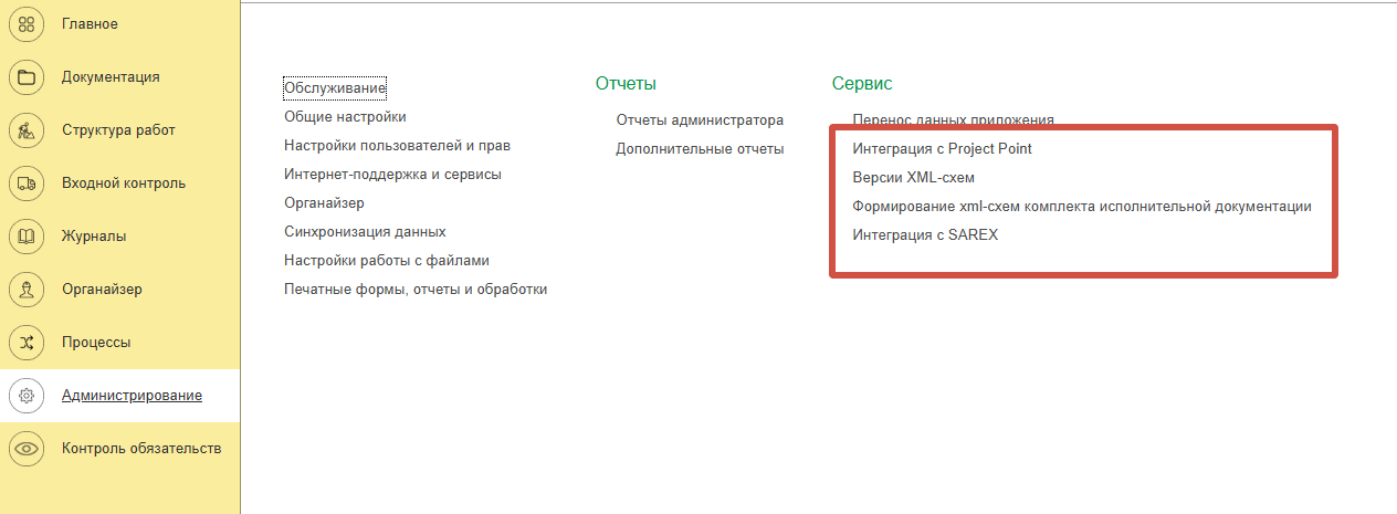 Для активирования интеграций с Project Point и СОД SAREX необходимо перейти в меню «Администрирование» (Рисунок 38), выбрать соответствующую интеграцию и поставить галочку напротив реквизита «Использовать интеграцию…» (Рисунок 39 и 40).
