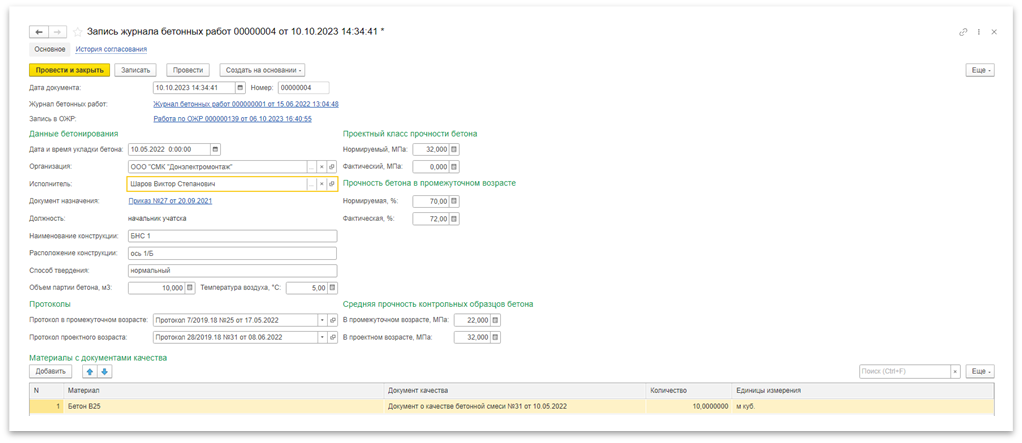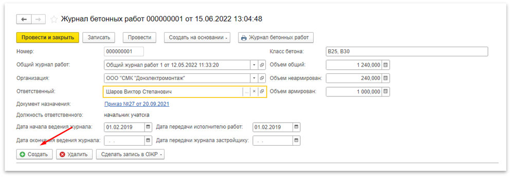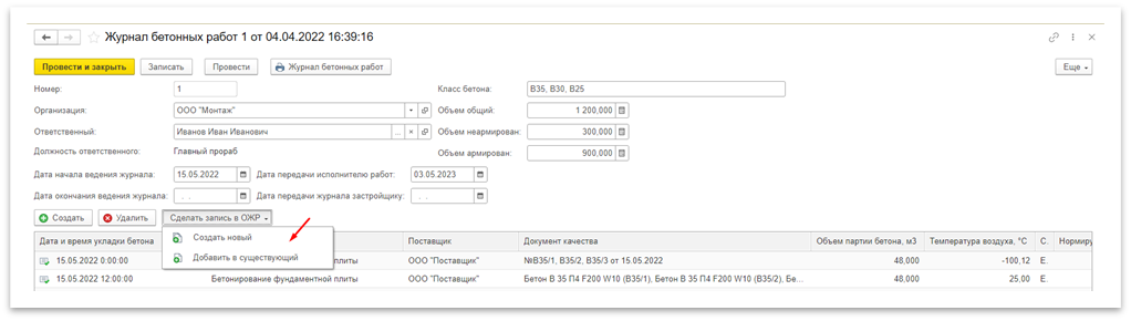 Рисунок 3 – Создание записи в ОЖР на основании записи спецжурнала