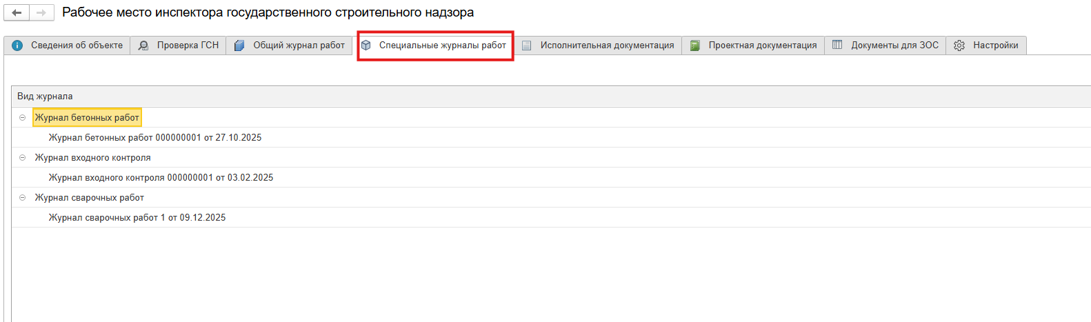 Вкладка «Специальные журналы работы» содержит все спецжурналы, которые ведутся на объекте.