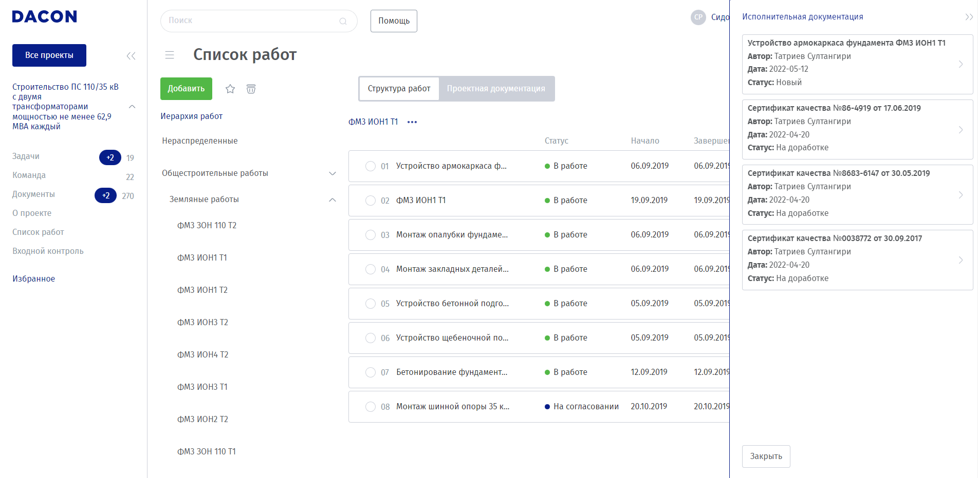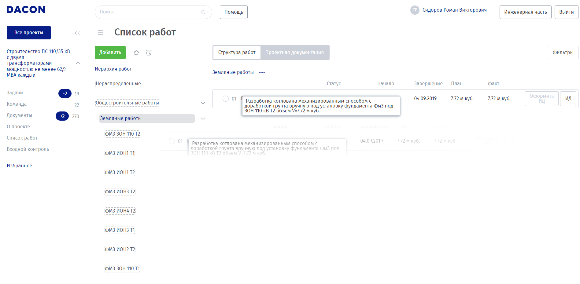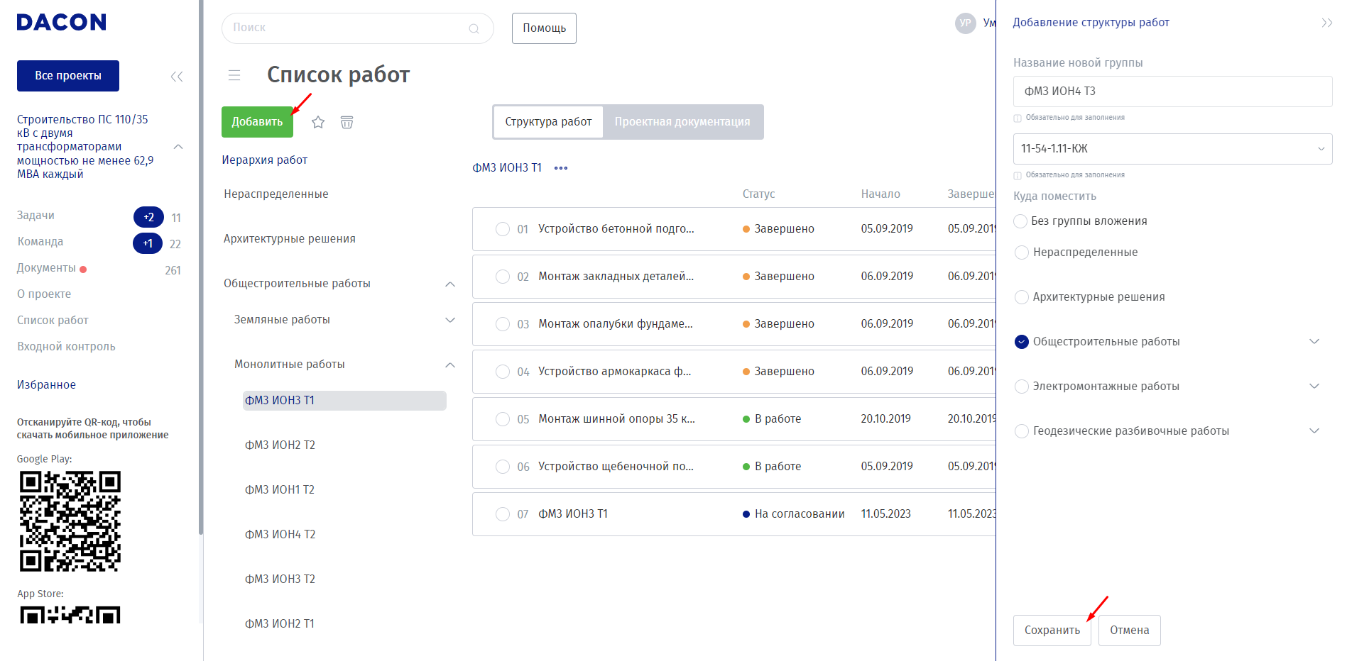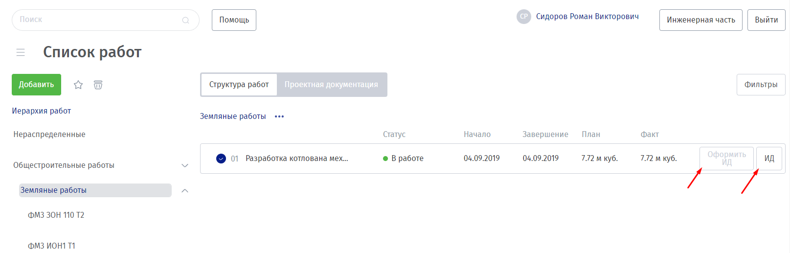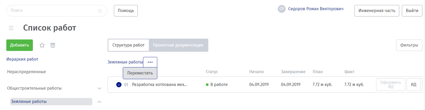 Список работ. Данный раздел предназначен для просмотра структуры работ и контроля выполнения конкретных элементов работы.