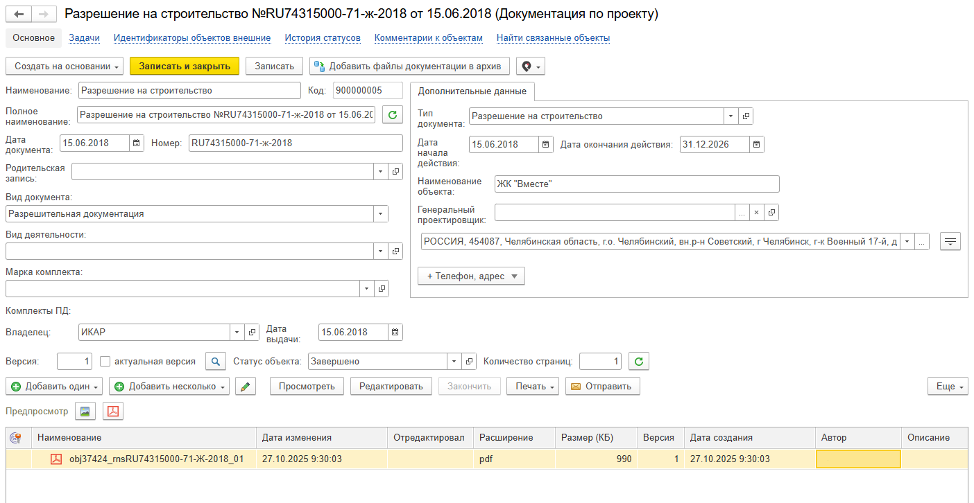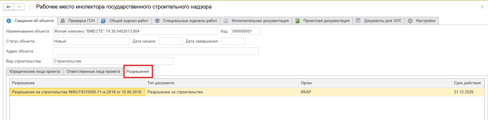 Раздел «Разрешения» содержит документ “разрешение на строительство”.