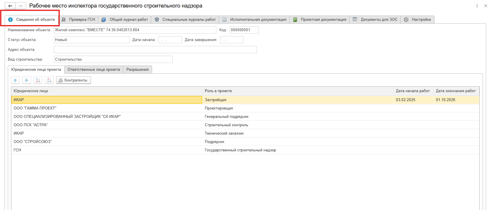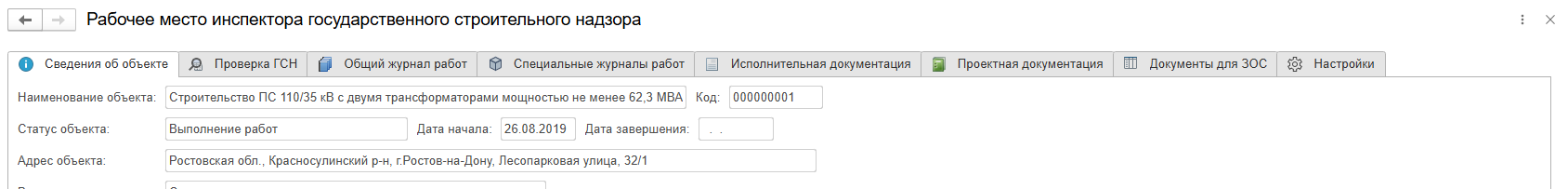 Рабочее место инспектора ГСН содержит несколько вкладок.