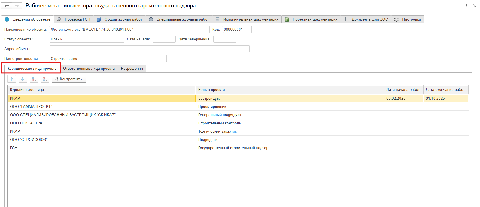 Раздел «Юридические лица проекта» содержит все юридические лица, участвующие в проекте с назначенными им ролями.