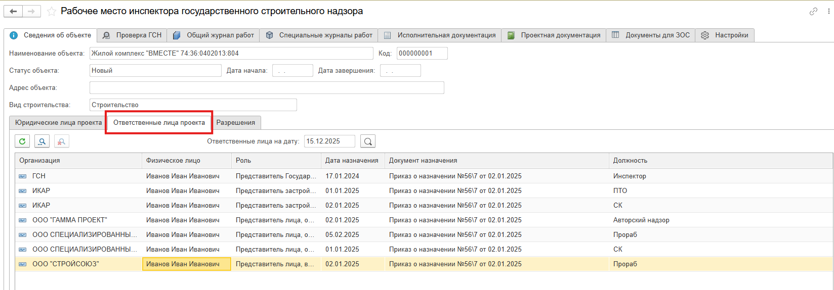 Раздел «Ответственные лица проекта» содержит всех представителей юридических лиц, а также их роль, которую они выполняют на проекте. Система отслеживает даты назначения и даты окончания полномочий.