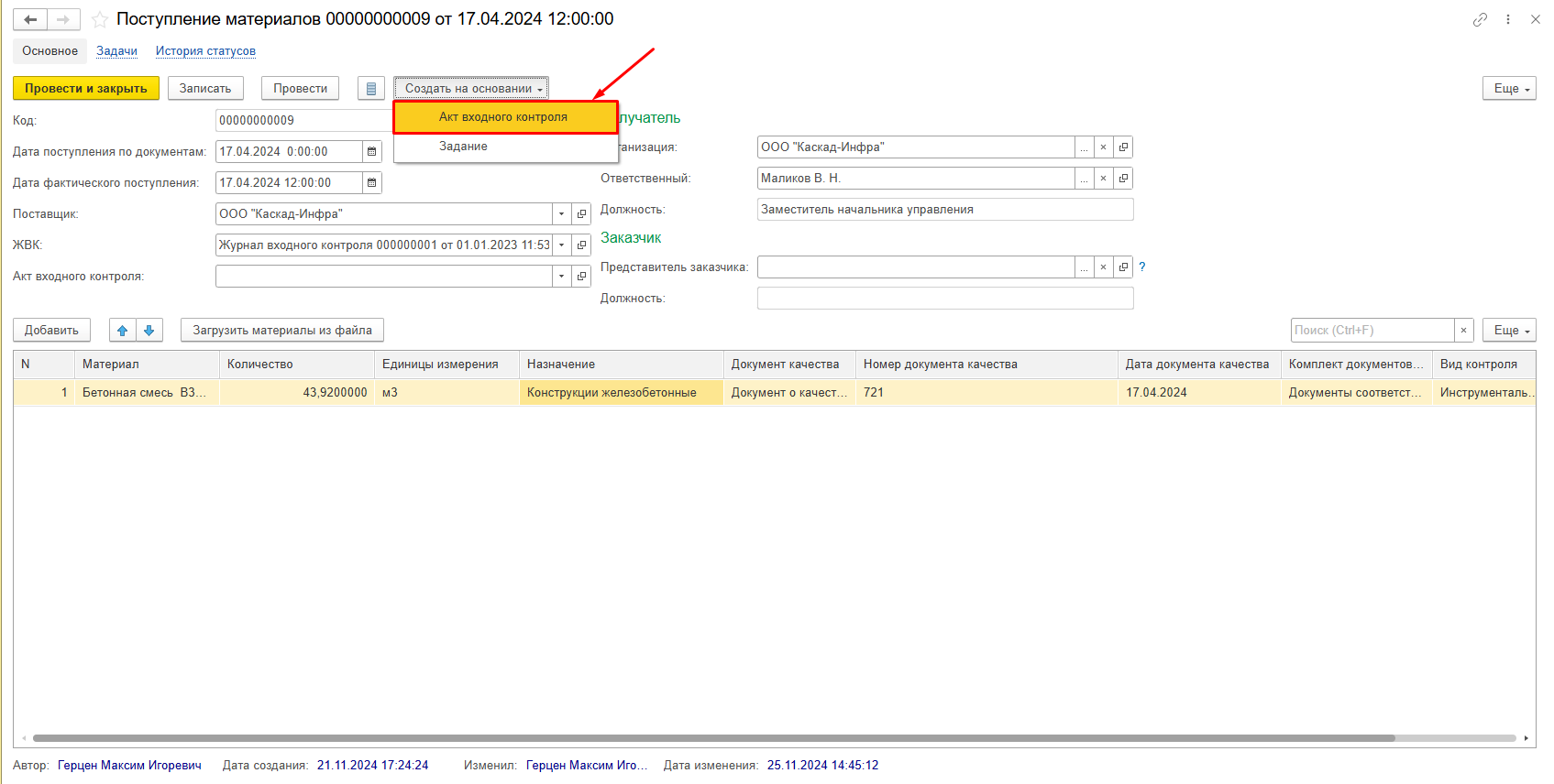 Если на входной контроль передаются партии материалов из одной поставки, то в соответствующем документе Поступление материалов можно воспользоваться кнопкой «Создать на основании — Акт входного контроля» (Рисунок 79). Система при этом сама создаст и откроет документ АВК и заполнит его данными о партиях материалов.