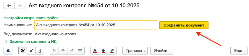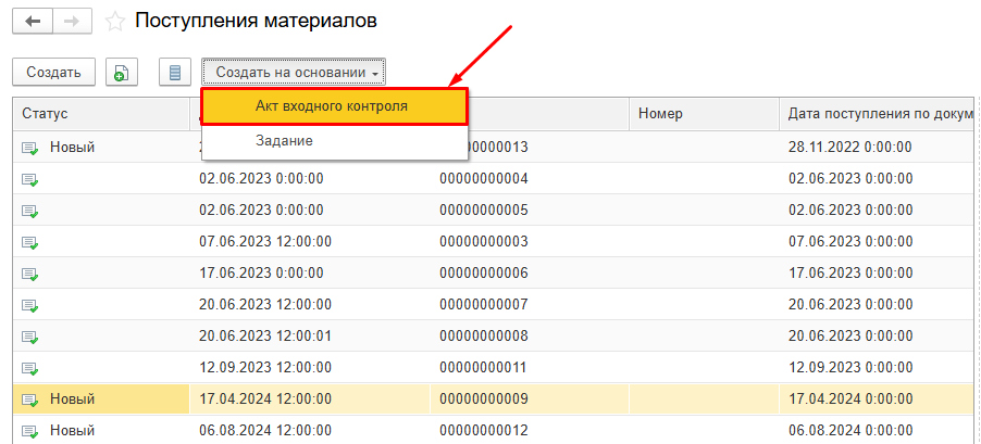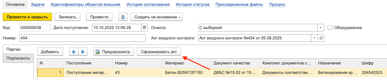 Если для поступившей партии материала создан Акт входного контроля, то он отображается в табличной части документа Поступление материалов.
