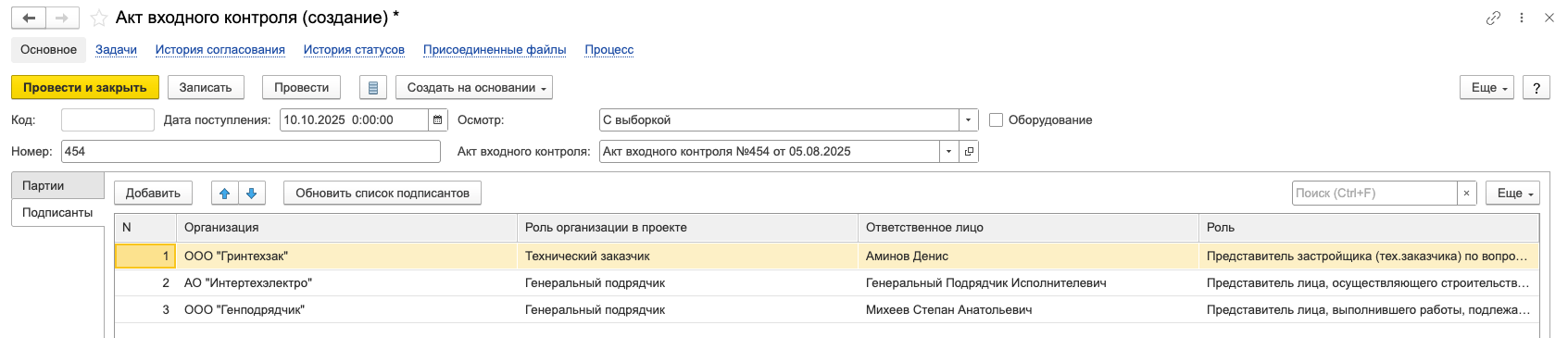 · Подписанты — список ответственных лиц, уполномоченных участвовать во входном контроле. Заполняется с помощью кнопки «Обновить список подписантов»: