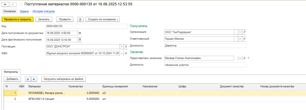 После того, как все материалы указаны, нажмите на кнопку «Провести и закрыть».