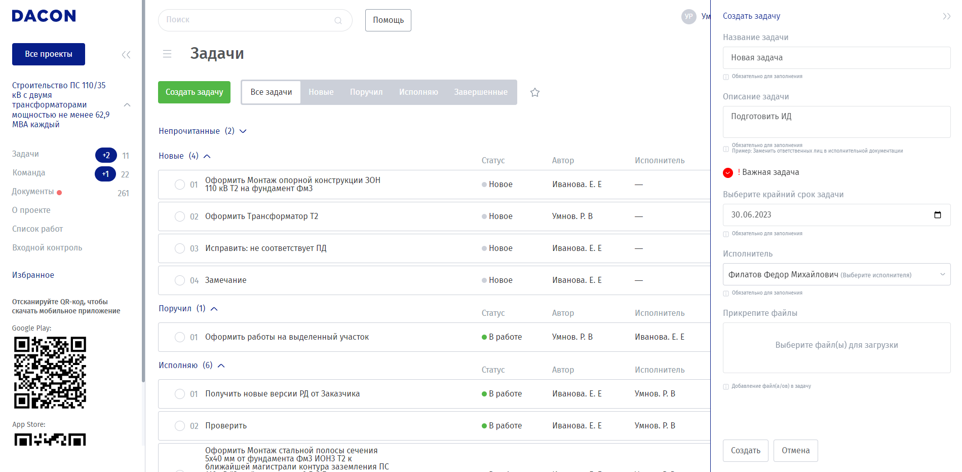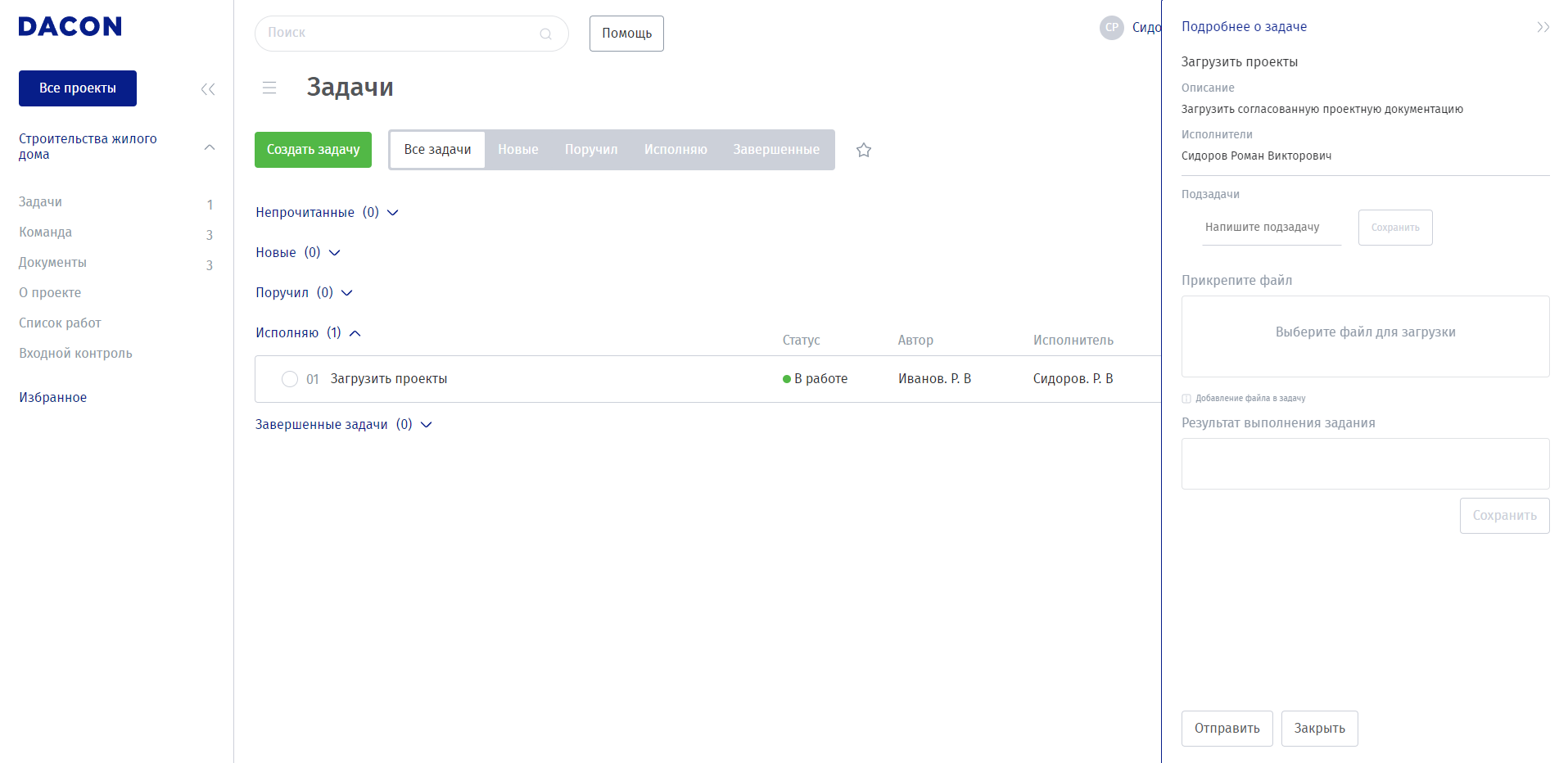 В разделе «Задачи» пользователю представлен список задач, которые он поручил, исполняет, и которые завершены.