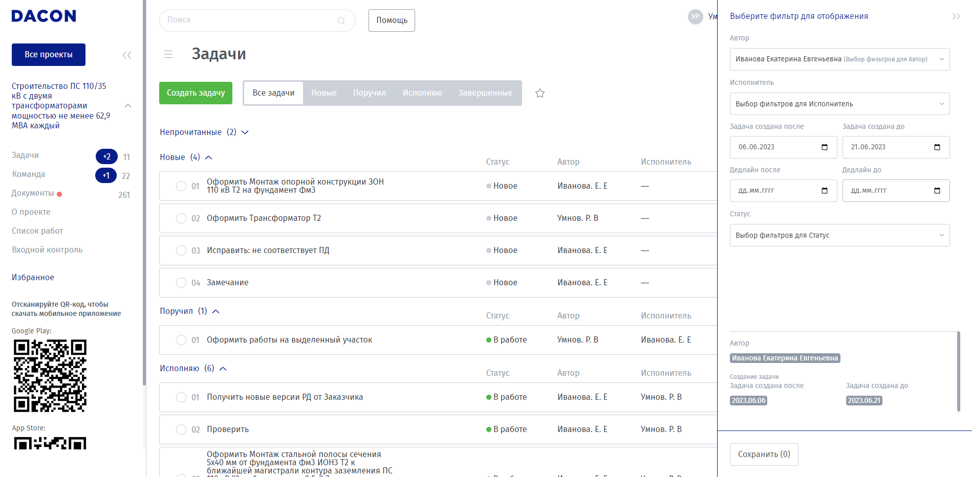 Фильтр по задачам. Нажать на кнопку «Фильтр», в открывшейся шторке указать необходимые данные для фильтрации: автор, исполнитель, даты создания и дедлайна, а также статус затем нажмите кнопку «Сохранить» для применения фильтра (Рисунок 27).