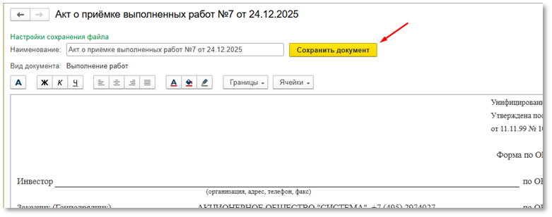 В открывшейся печатной форме нажать на кнопку «Сохранить документ» (см. рисунок ниже):
