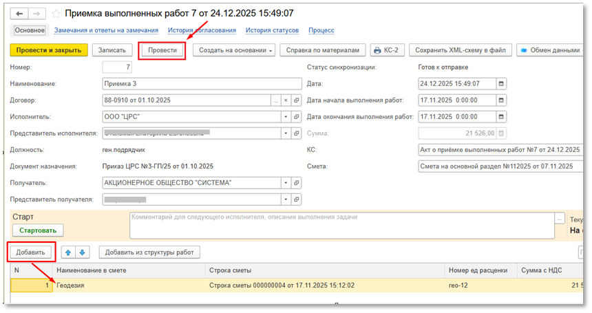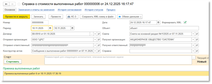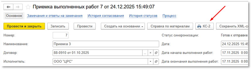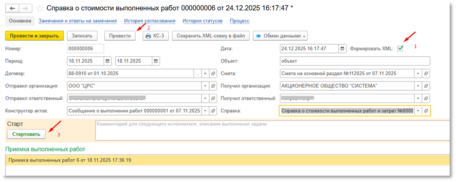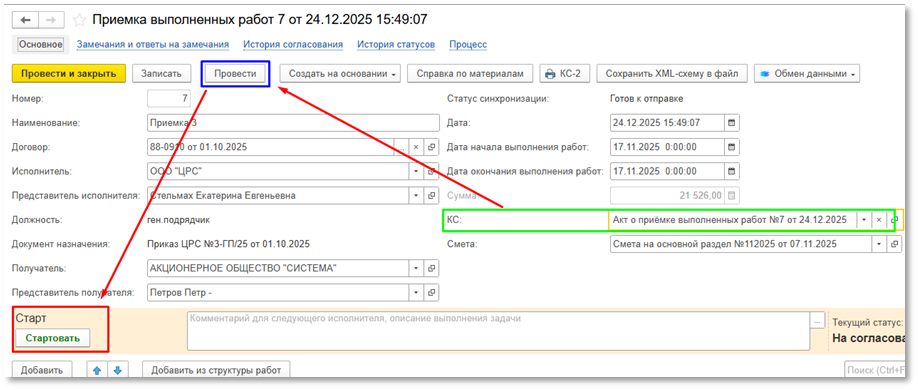 После создания печатной формы акта, ссылка на КС-2 указывается в соответствующем реквизите «КС» в Приемке работ. Далее нужно провести документ и стартовать процесс (см. рисунок ниже):