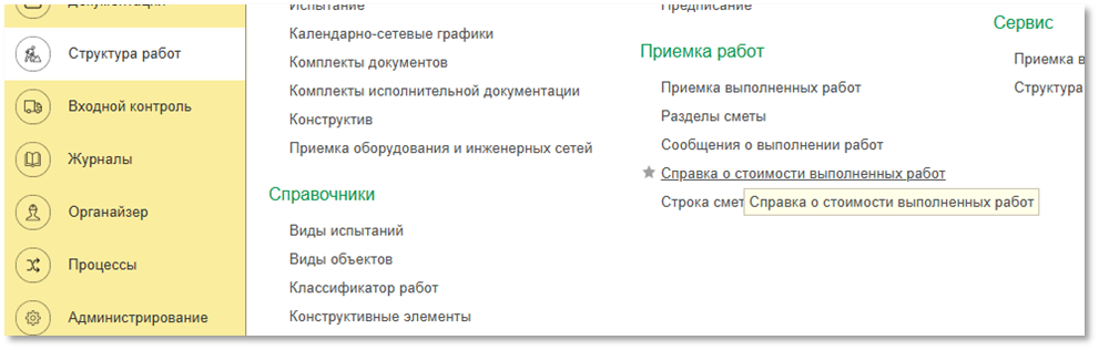 Структура работ → Раздел «Приемка работ» → Справка о стоимости выполненных работ (см. рисунок ниже):