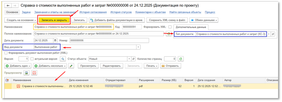 После сохранения документа, системой создается запись справочника Документация по проекту с видом документа «Выполнение работ» и типом документа «Справка о стоимости выполненных работ и затрат (КС-3)», в которую подгружается созданный файл акта КС-3.