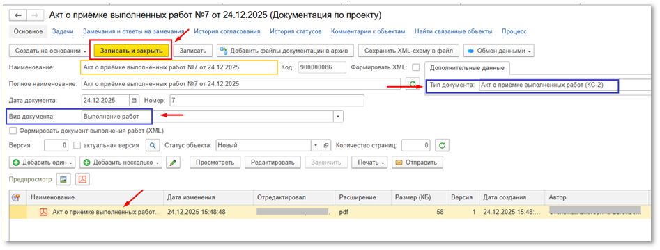 После сохранения документа, системой создается запись справочника Документация по проекту с видом документа «Выполнение работ» и типом документа «Акт о приемке выполненных работ (КС-2)», в которую подгружается созданный файл акта КС-2.