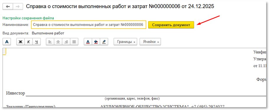 После создания печатной формы акта, ссылка на КС-3 указывается в соответствующем реквизите «Справка» в «Справке о стоимости выполненных работ».