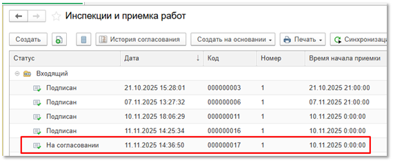 Шаг 1 - ГП получает сведения по проведенному КМ в виде нового документа Инспекции и приемка работ с видом «Входящий» (см. рисунок ниже):