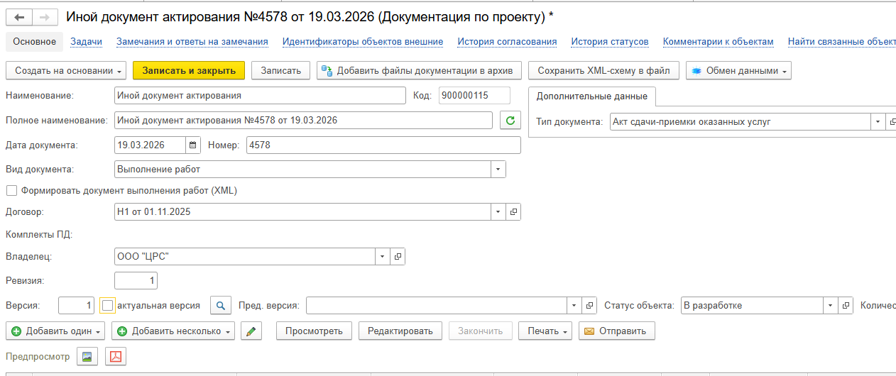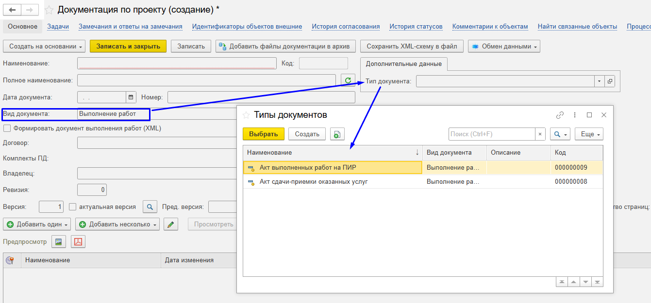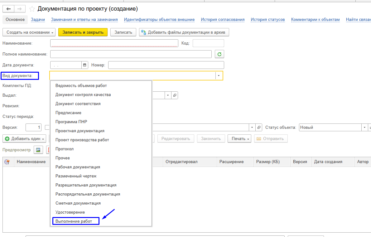 Шаг 1 - создать новую запись справочника "Документация по проекту"