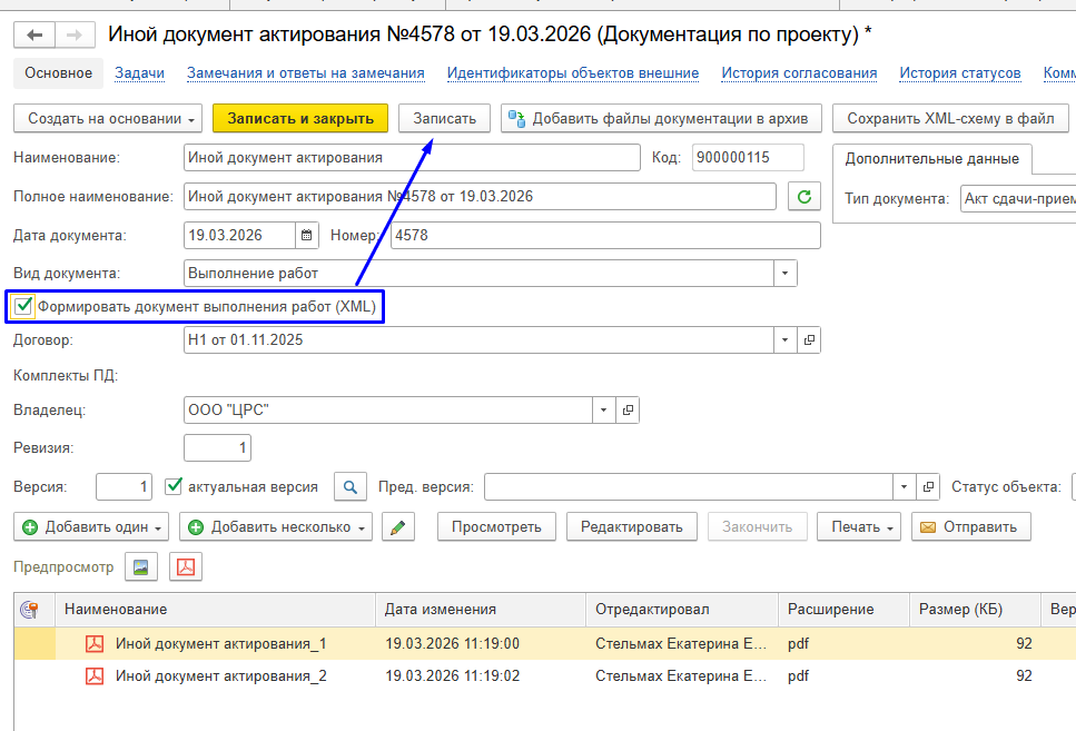 Шаг 5 - проставить признак "Формировать документ выполнения работ (XML)" → далее кнопку "Записать" (см. рисунок ниже):