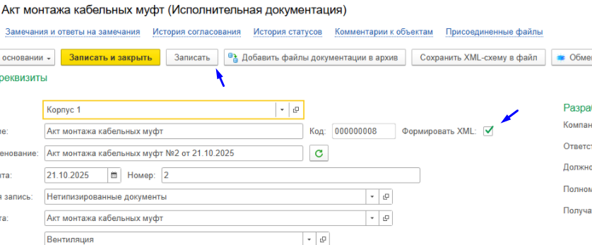 Шаг 5 - проставить признак "Формировать XML" → далее повторно нажать на кнопку "Записать" (см. рисунок ниже):