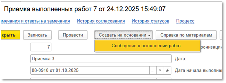 После заполнения нужно провести документ и создать на его основании Сообщение о выполнении работ (см. рисунок ниже):
