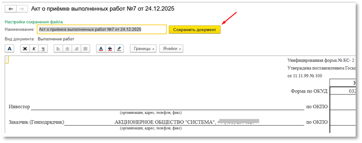 Далее нажать на кнопку «КС-2» для создания печатной формы акта, после чего сохранить документ (см. рисунок ниже):