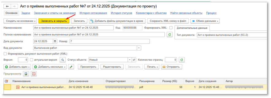 Откроется форма записи справочника Документация по проекту с предзаполненными данными и подгруженным файлом (см. рисунок ниже) → необходимо нажать «Записать и закрыть»:
