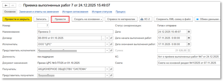 После заполнения всех реквизитов, необходимо провести документ (см. рисунок ниже):