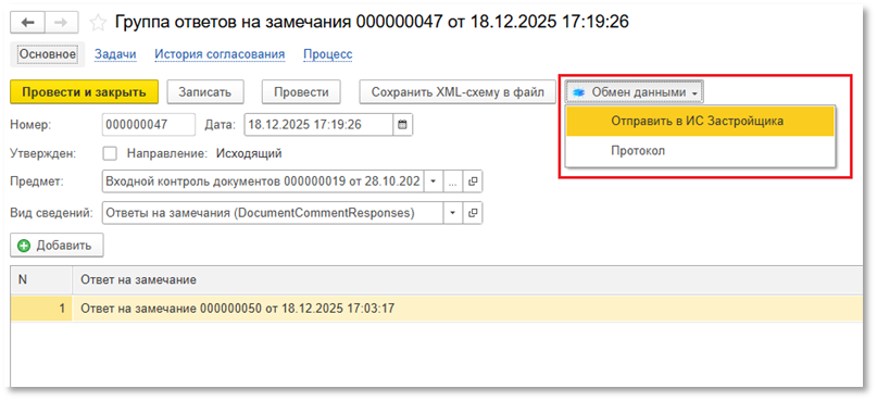 - Нажать кнопку «Отправить в ИС Застройщика»