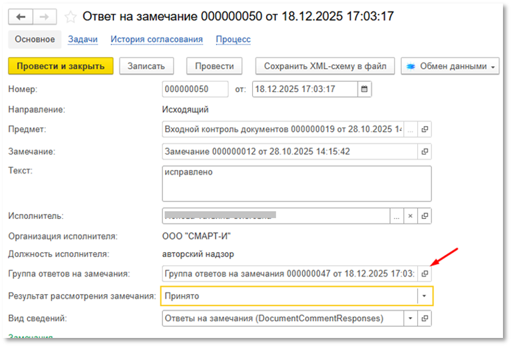 После проведения документа, автоматически создается Группа ответов (см. рисунок ниже):