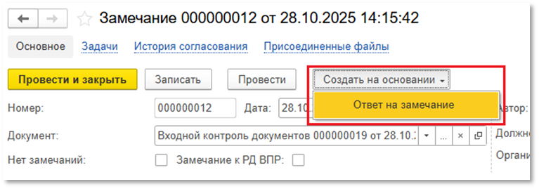 - нажать кнопку «Создать на основании» → Ответ на замечание