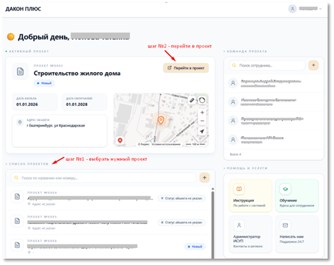 · Выберите проект из списка проектов (см. шаг №1 на рис. ниже) и нажмите «Перейти в проект» (см. шаг №2 на рис. ниже):