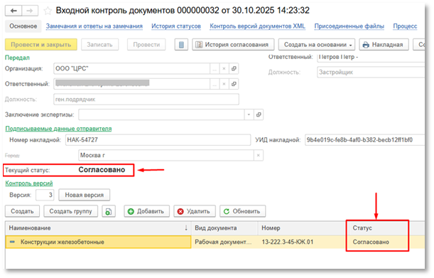 Работа с текущим документом завершается в статусе «Согласовано», такой же статус появится и у всех документов, указанных в табличной части (см. рисунок ниже):