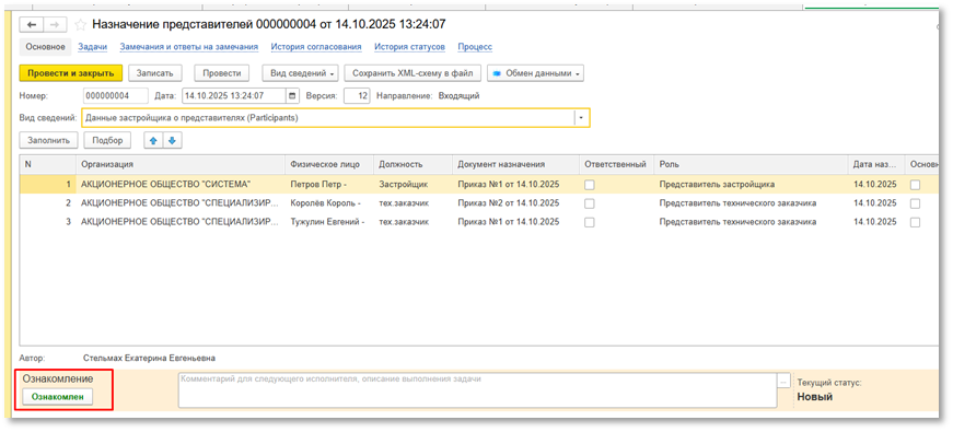 При получении из ИС Застройщика данных о представителях Застройщика и Технического заказчика, автоматически создается документ «Назначение представителей» с видом сведений «Данные застройщика о представителях».