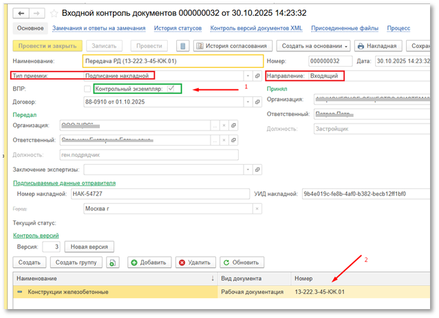 При приемке сообщения из ИС Застройщика в системе автоматически создается новый документ Входной контроль документов с типом «Подписание накладной» и направлением «Входящий».