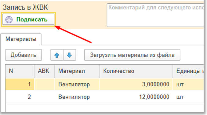Рис. "Кнопка подписания поступления"