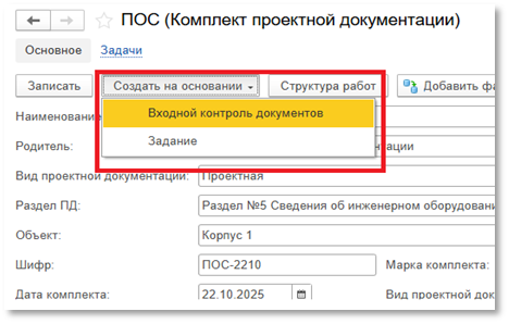 Создать новый документ «Входной контроль документов» можно по кнопке «Создать на основании» на форме Комплекта проектной документации (Рис.см. №54)рисунок ниже):