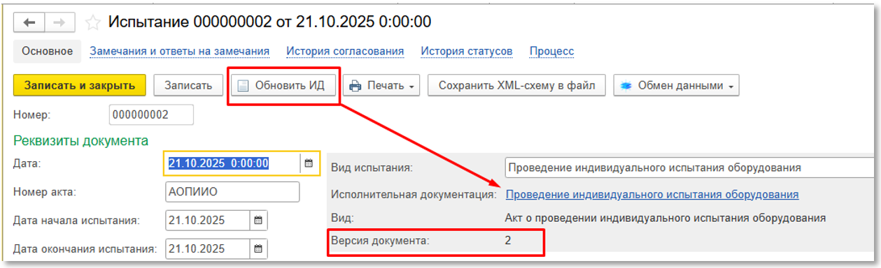 Нужно будет внести необходимые изменения и сформировать, и подписать новую версию акта испытания (см. рисунок ниже):