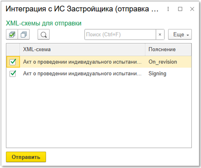 На подпись Застройщику акт испытания направляется с помощью меню обмена (см. рисунок ниже):