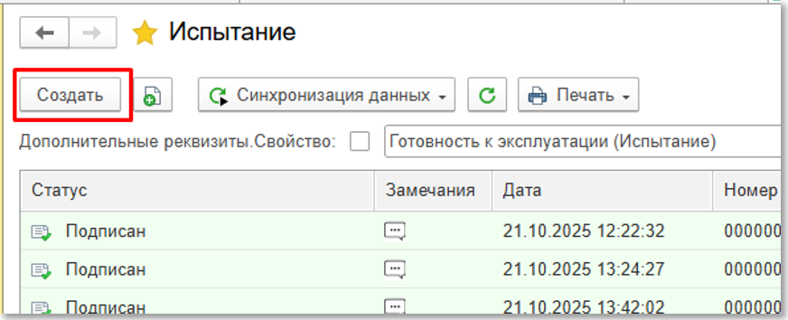 Для того, чтобы добавить сведения о проведенном испытании, нажмите Создать (см. рисунок ниже):