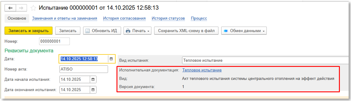 Созданный акт испытания появится на форме документа (см. рисунок ниже), после чего снова нужно будет нажать «Записать» и приступить к подписанию документа ЭП.